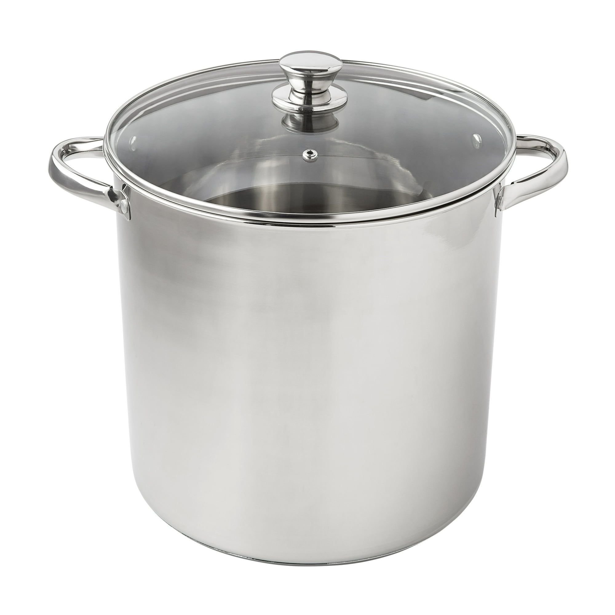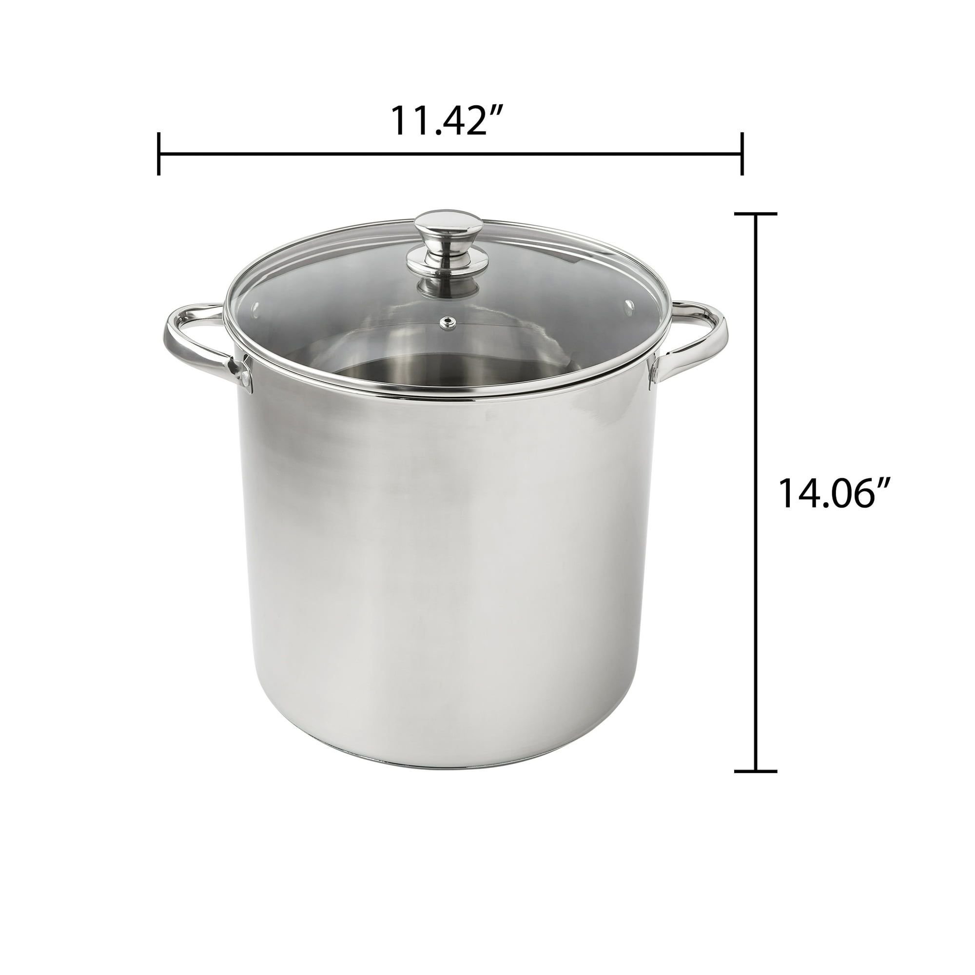 Prepare amazing sauces, soups, pastas, and more with the sizable Mainstays Stainless Steel 16-Quart Stock Pot with Glass Lid. This extra-large stock pot measures 11.02'L x 11.02'W x 10.63'H and is perfect for cooking family meals for any occasion. Designed with stylish stainless steel and glass, it's sure to coordinate with your existing cookware. This sturdy stock pot features stay-cool handles and a helpful, transparent glass lid, along with durable, stainless steel construction. Ideal for helping you feed your family and friends at get-togethers, backyard barbecues, celebrations, and other special events, the Mainstays Stainless Steel 16-Quart Stock Pot with Glass Lid is a must-have cookware item in any kitchen.
