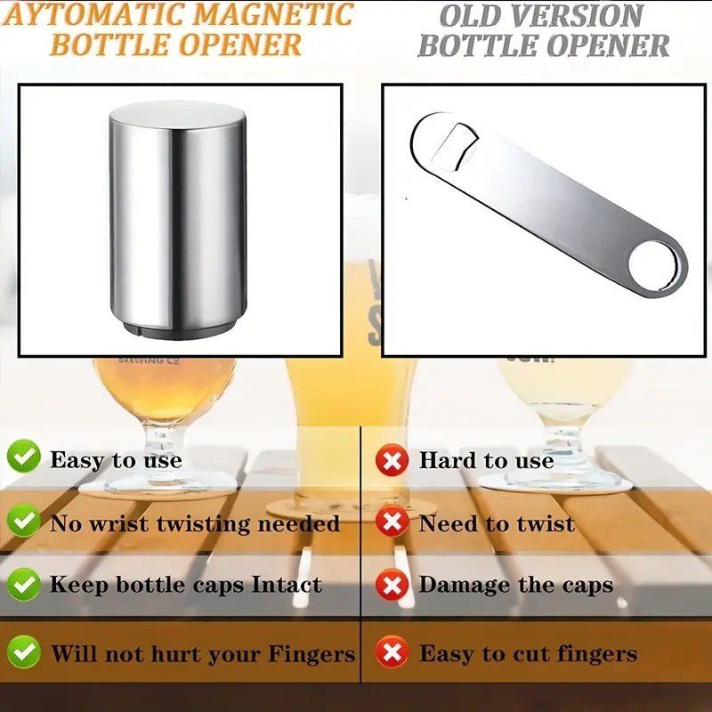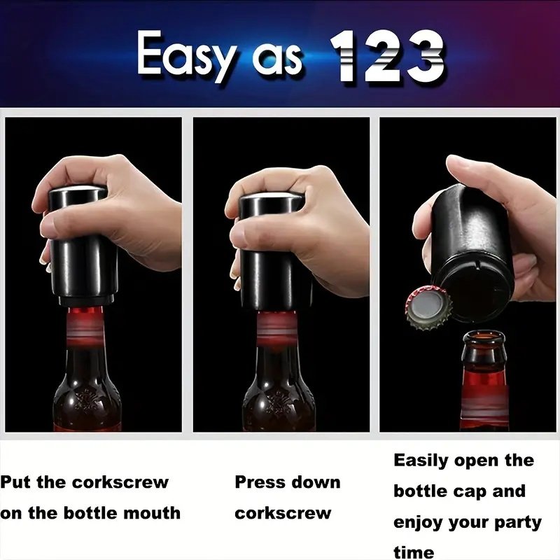 [Spring Loaded Bottle Opener]Just place this automatic bottle opener on the bottle cap, press it down to the end, and then pop it off.With the magnet, it can holds the lid in place, won't bend the lids once, which makes it great for lid collectors.[Powerful Durable]This beer bottle opener for beer is built to last and can open many bottles within minutes, allowing you to spend more time with your guests. And you can opener the bottle after bottle. Our bottle opener is small enough to store discreetly away when not in use. Keep the automatic beer opener next to your fridge, storage rack, credenza, etc.[High-quality material]This material is composed of stainless steel, high-quality plastic and magnets. Beer openers feature a smooth surface with good hand feel, small and portable, perfect for bars and home, picnic, camping, fishing, hiking and more.[Great Gifts for Beer Lovers]For people who like to drink beer or beverages in bottle, this is a cool gadget gift, and they can enjoy more fun from poping and drinking. Perfect for man gifts, Christmas, Father's Day, housewarming, secret Santa, Valentine's Day, anniversary, baby shower, wedding party ,birthday party gifts or any other special occasions![ After sales Guarantee ] As long as you have any dissatisfaction during the use of this beer bottle opener, we can provide you with unconditional return and refund, aiming to give you a pleasant shopping experience