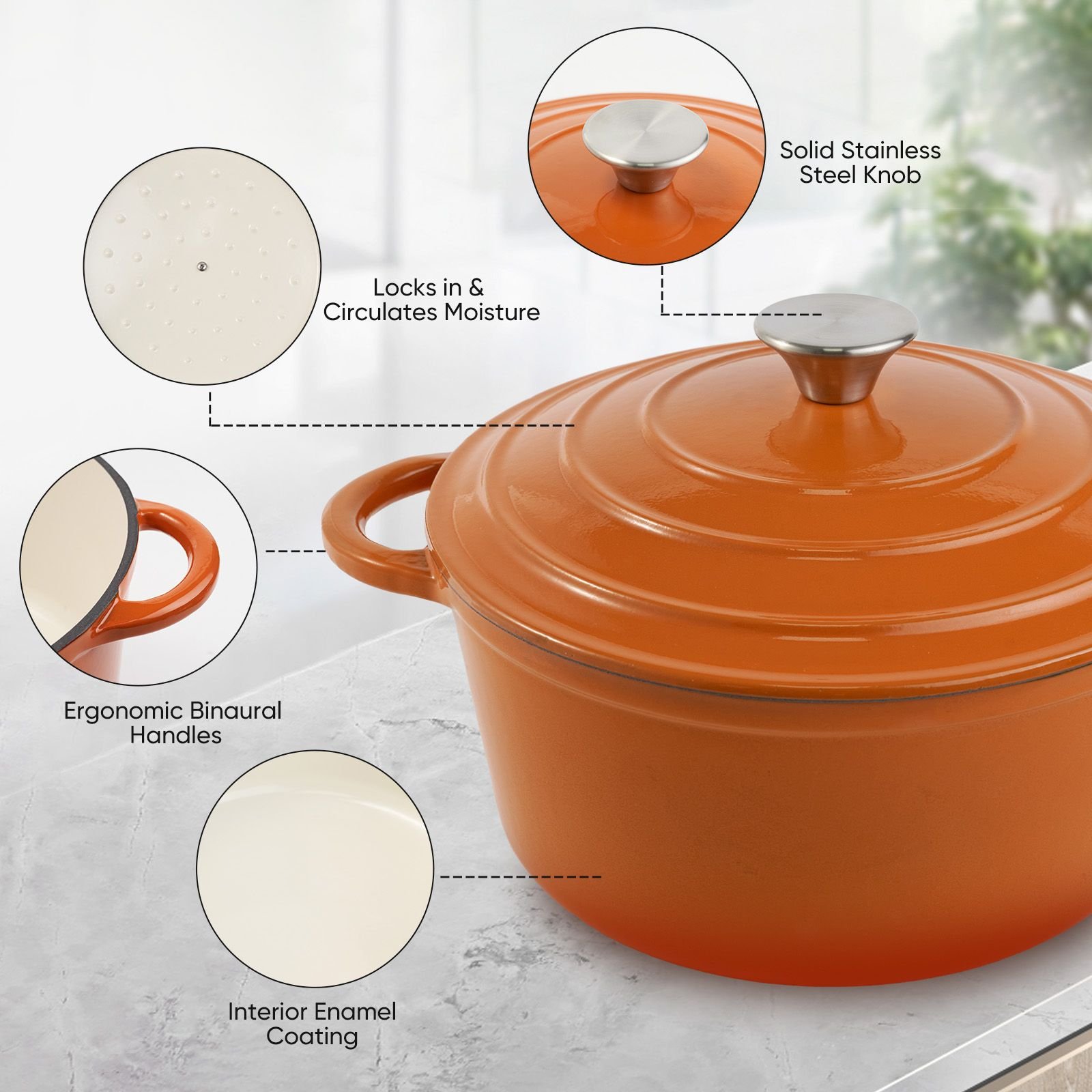 ��ENCLOSED THERMAL CIRCLE: This enameled dutch oven pot is design with circulating shower type lid, the raised design of the pot cover allows water vapor to circulate in the pot and locks the nutrition and moisture of the food, evenly fall on the food to maintain the original nutrition, possess pretty heat retention performance.