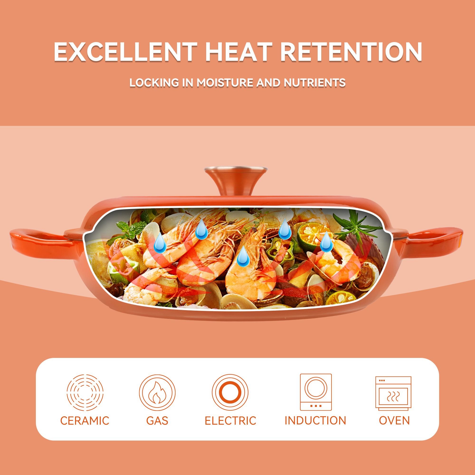 ��ENCLOSED THERMAL CIRCLE: This enamel Dutch oven adopts a circular shower type lid design, with a convex lid design, allowing water vapor to circulate in the pot, locking in the nutrients and moisture of the food, evenly falling on the food, maintaining the original nutrients, and having good thermal insulation performance.