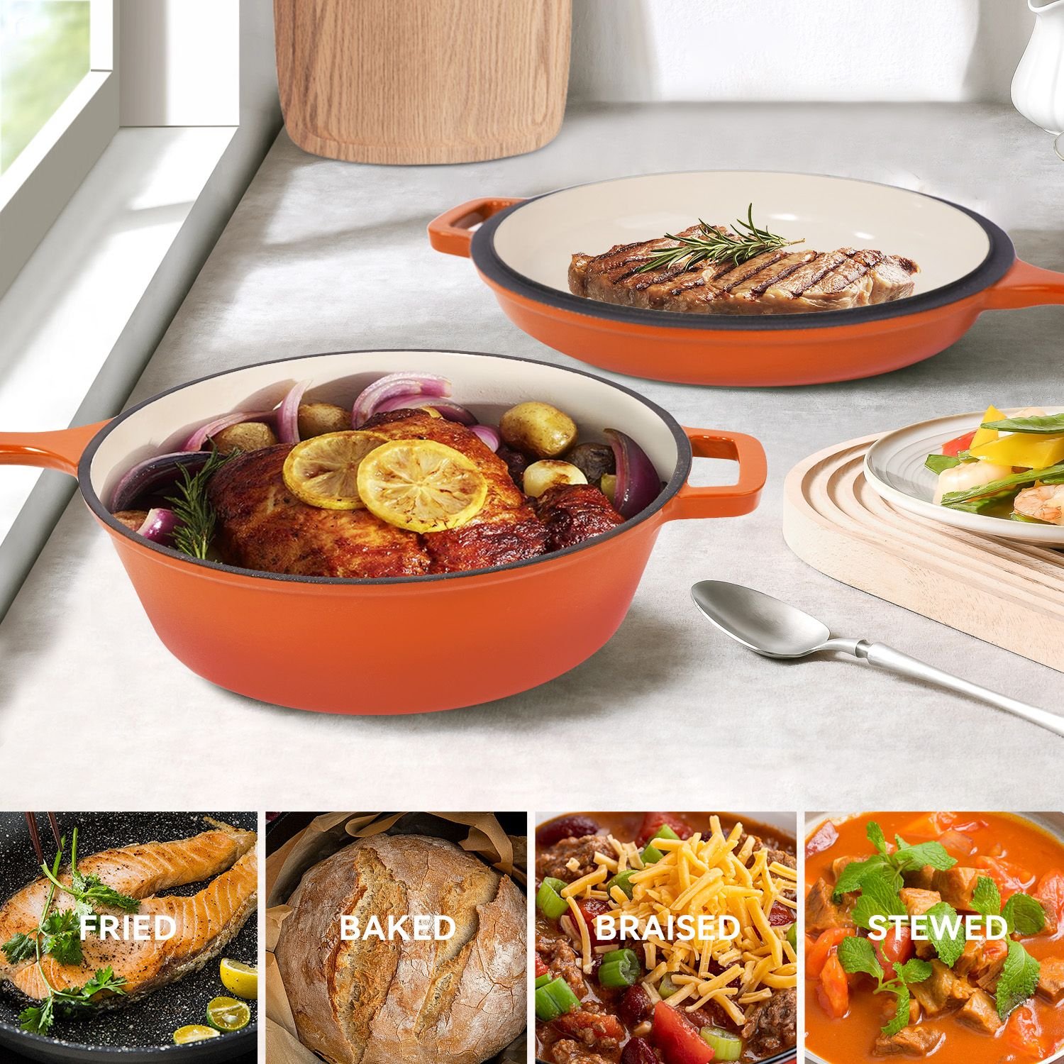 ��ENCLOSED THERMAL CIRCLE: This enamel Dutch oven adopts a circular shower type lid design, with a convex lid design, allowing water vapor to circulate in the pot, locking in the nutrients and moisture of the food, evenly falling on the food, maintaining the original nutrients, and having good thermal insulation performance.