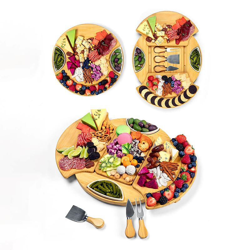 Practical recessed, pullout compartment within for storing important cheese board utensils.
