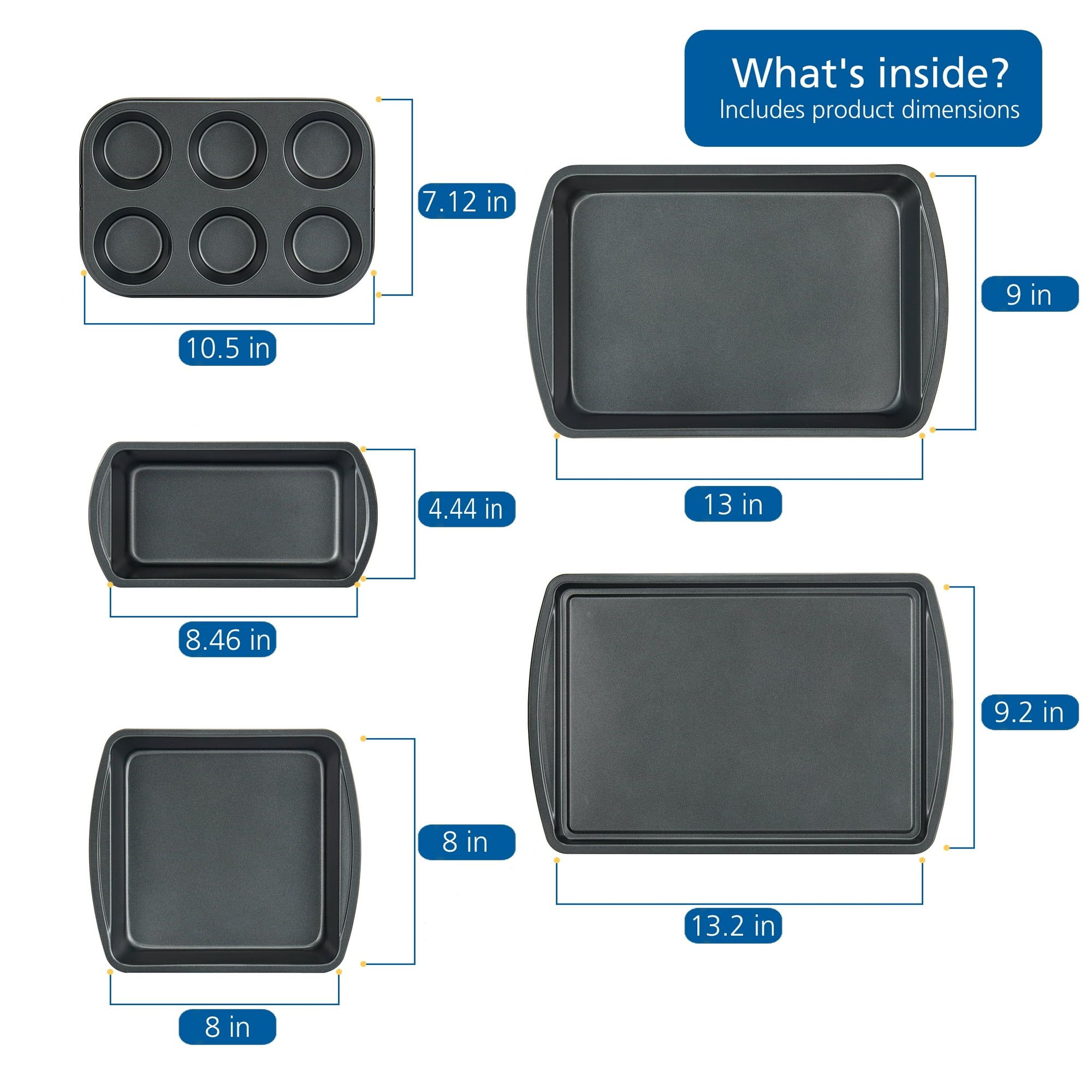 1.Including: 1 Square Pan 8 IN D (20.3 x 20.3cm); 1 Roster Pan 13 IN L x 9 IN W (33 x 22.8cm); 1 Cookie Sheet 13.2 IN W x 9.2 IN D (33.6 x 23.5cm); 1 6 Cup-Muffin Pan 10.5 IN W x 7.12 IN D (26.7 x 18.1cm); 2 Loaf Pan 8.46 IN W x 4.44 IN D (21.4 x 11.2cm)