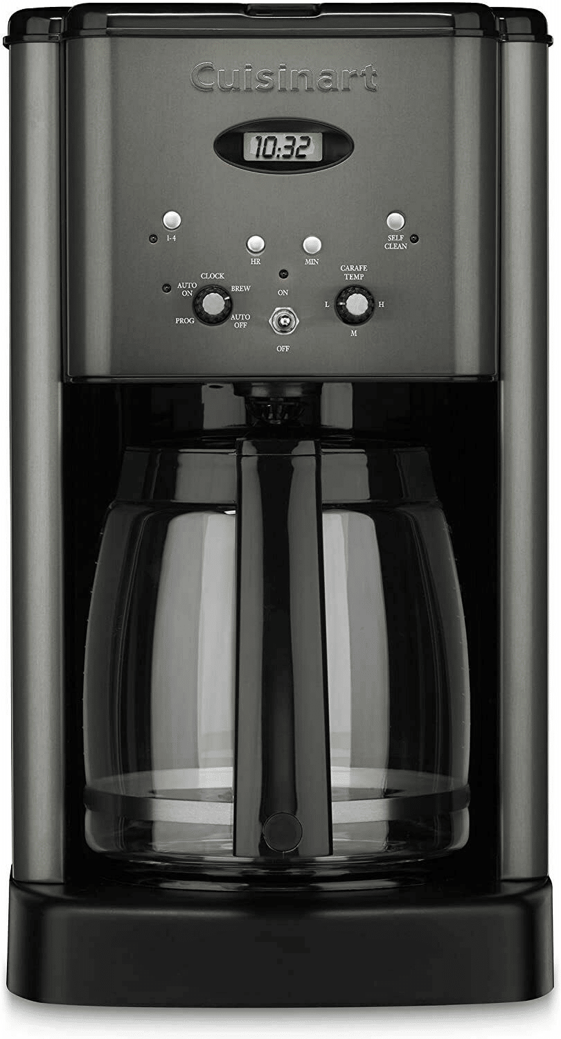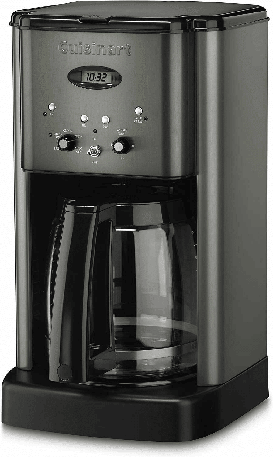 Classic brushed metal design with a 12-cup carafe with ergonomic handle for comfortable; dripless pouring and knuckle guardBrew Pause feature lets you enjoy a cup of Coffee before brewing has finished. Adjustable heater plate (low; medium; high) ensures that your Coffee stays at the temperature you like best24-Hour Advance brew start; programmable auto shutoff from 0 to 4 hours; Plus a 1- to 4-cup feature when making less than 5 cupsIncludes: charcoal water filter and permanent gold tone filter that ensures only the freshest Coffee flavor flows through. Measuring scoop. Instruction bookUnit Dimension: 9" L x 7. 75" W x 14" H