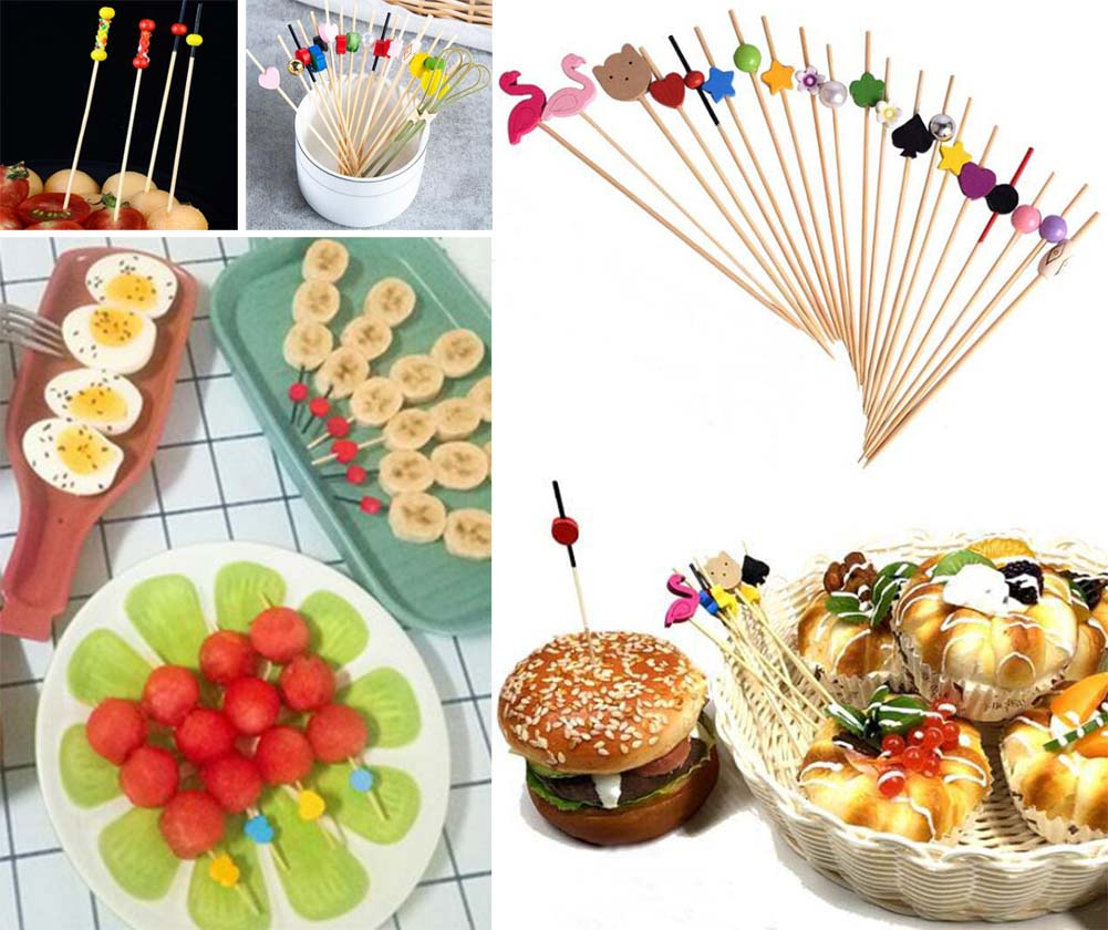 3.These decorative bamboo sticks can be applied to cocktail, juice, fruit, dessert, sandwich, salad, cake, appetizers and skewer.